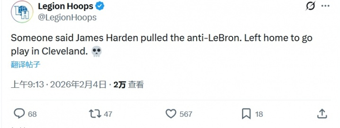 美媒Legion Hoops调侃道:“有人表示,哈登就是反向詹姆斯。一个离开家乡(洛杉矶)去克利夫兰骑士打球,一个离开家乡(克利夫兰)去洛杉矶湖人打球。”