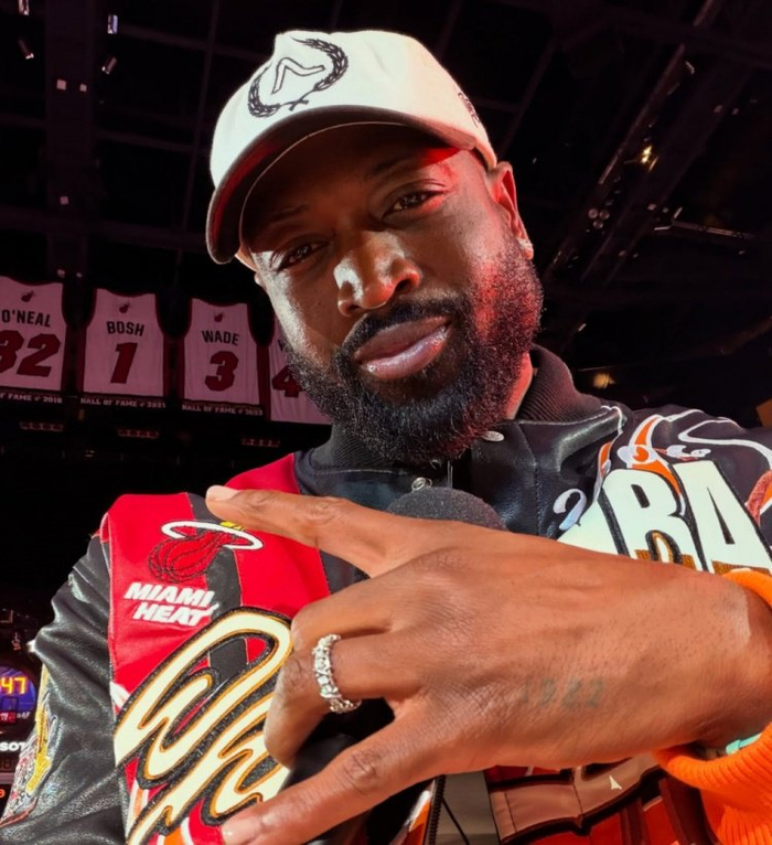 韦德在活动结束后晒出了一张在球场中央的自拍,而背景可以看到当年一起夺冠的奥尼尔、哈斯勒姆退役球衣,以及后来的队友波什的退役球衣。