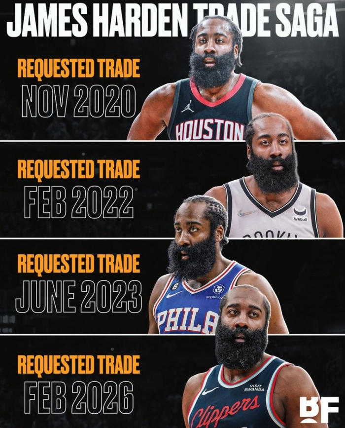 2026年2月,名记Shams报道,快船正努力促成哈登在交易截止日前离队,后续报道称,是哈登和哈登的团队向快船提出了离队想法。