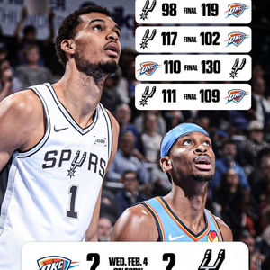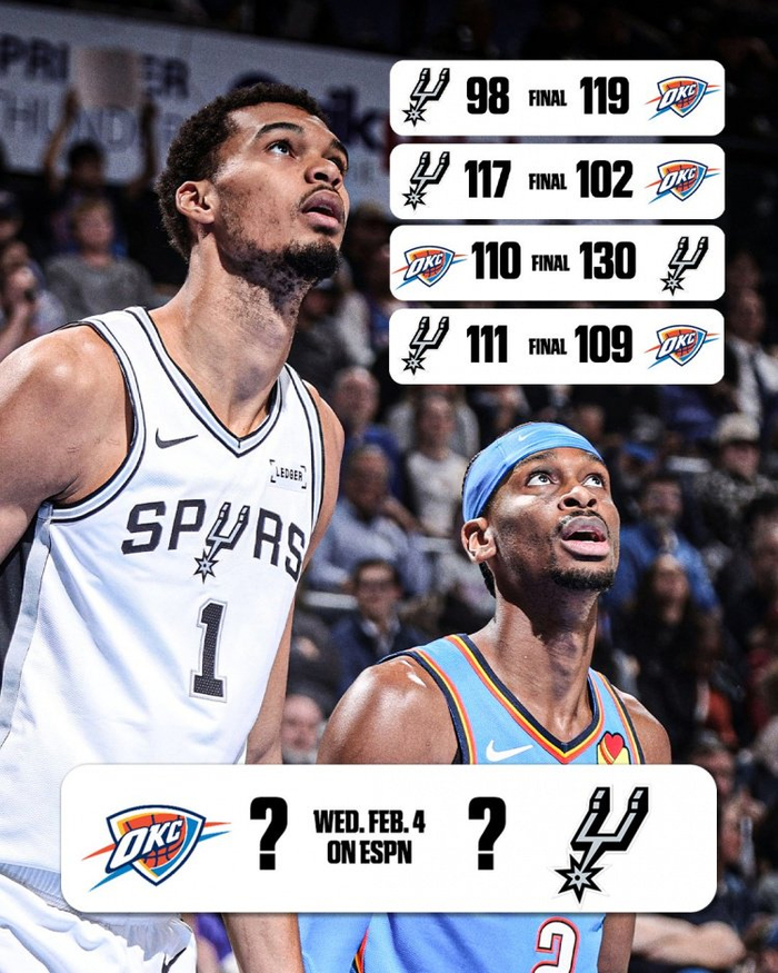 ESPN晒出了本赛季雷霆和马刺交手纪录(雷霆1-3马刺),写道:“本赛季常规赛双方最后一次交手,雷霆将客战马刺,谁能赢?”