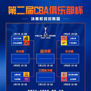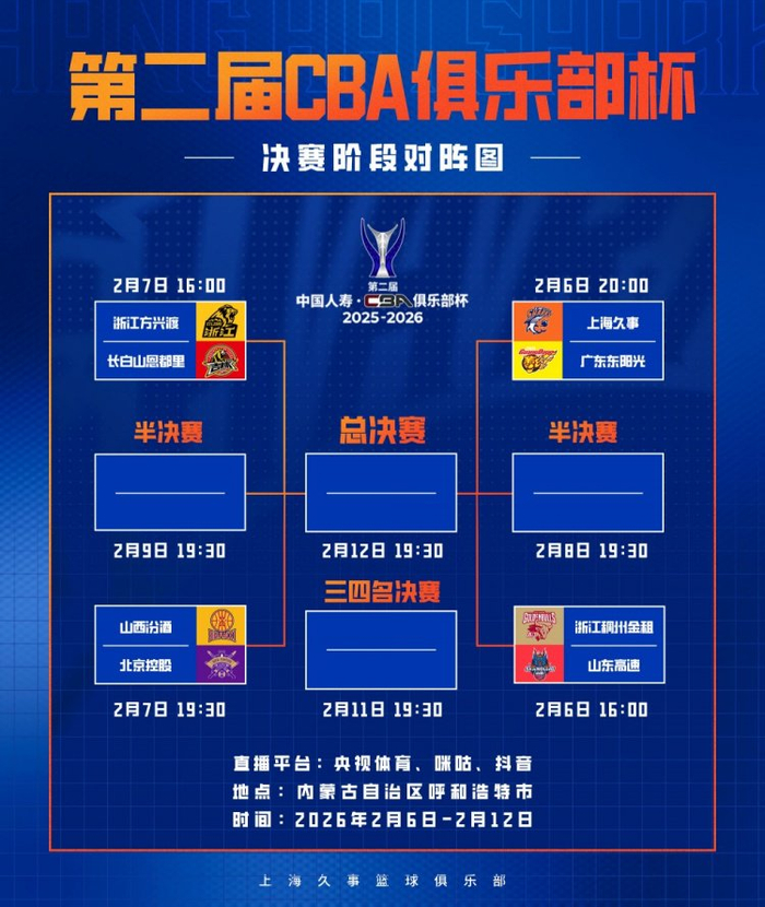 直播吧2月5日讯 上海男篮官博晒出了第二届CBA俱乐部杯决赛阶段对阵图和赛事信息。