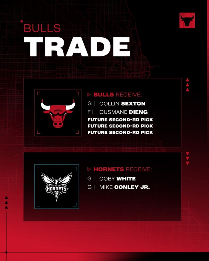这笔交易中,公牛送出科比·怀特和康利,换来黄蜂的塞克斯顿、乌斯曼·吉昂和3个次轮签(一个29年,两个31年)。