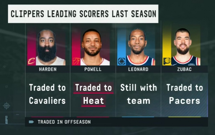快船上季四人组只剩小卡:哈登赴骑士 大祖去步行者 鲍威尔去热火
