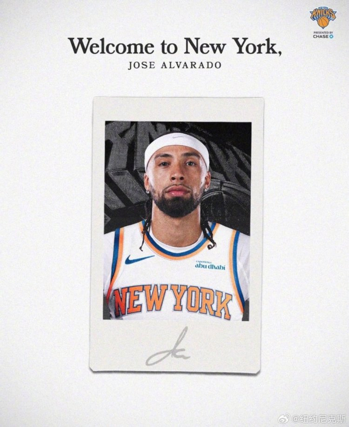 球队官方微博发文欢迎阿尔瓦拉多:“🗽欢迎来到纽约,六哥阿尔瓦拉多💙🧡来了就是自己人,恭喜成为一名尼克斯💙🧡”