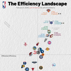 过去10场攻防效率:尼克斯黄蜂绿军骑士攻防俱佳 篮网独一档垫底