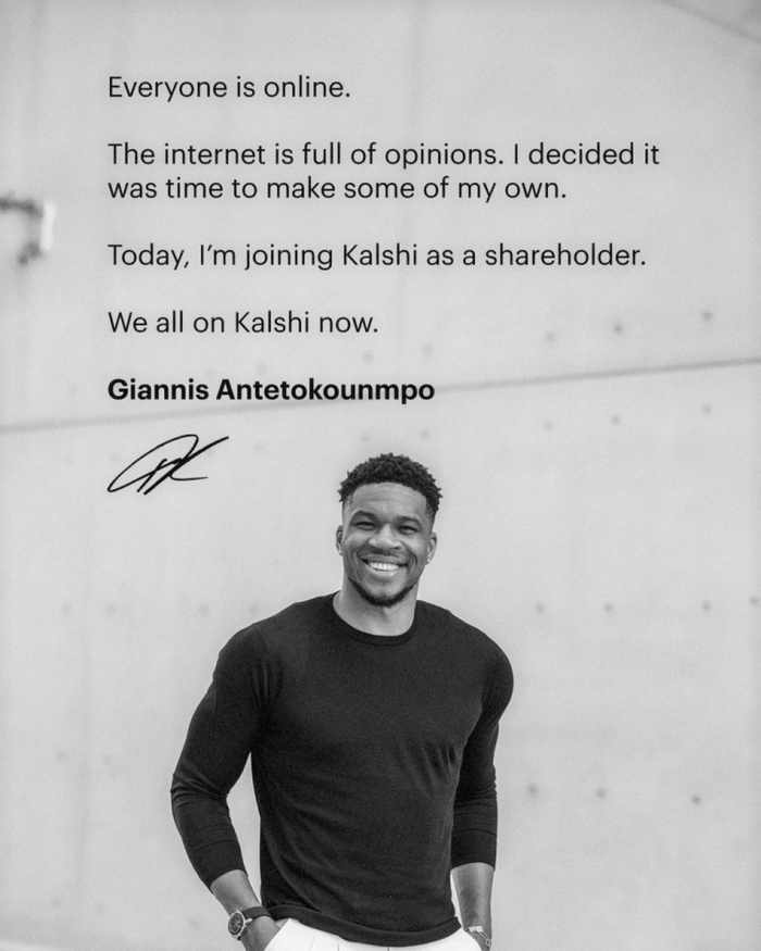 直播吧2月7日讯 今日雄鹿球星字母哥宣布,自己将以股东身份加入体育预测平台Kalshi Sports。