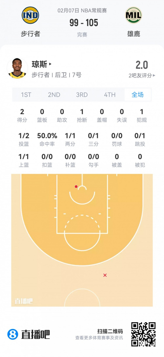 步行者次轮38号秀卡姆·琼斯 登场12.7分钟