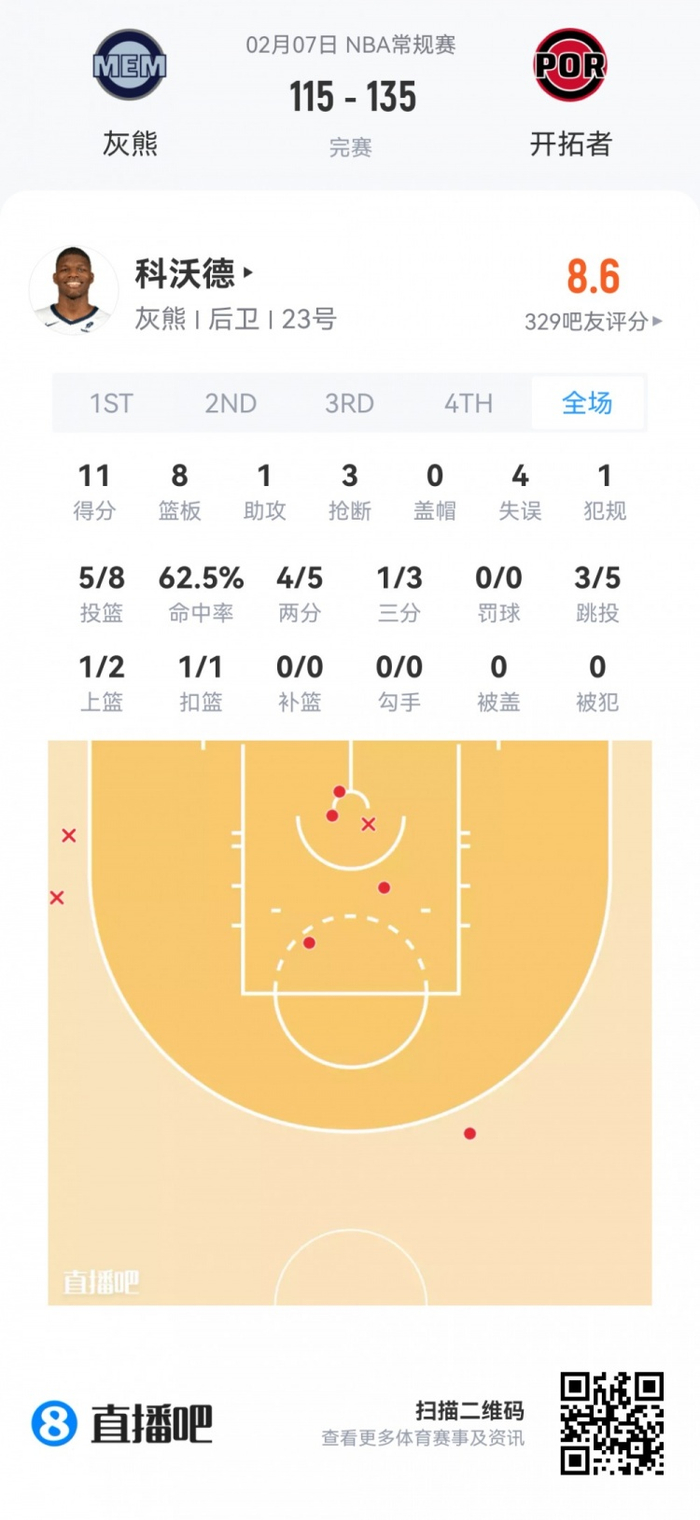 灰熊首轮11号秀科沃德 登场25分钟