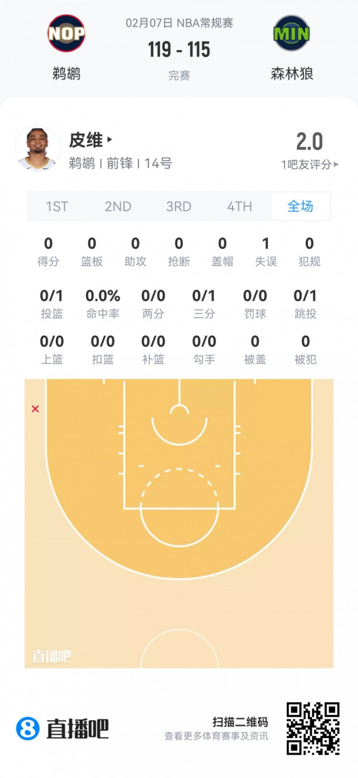 鹈鹕次轮40号秀米卡·皮维 登场2.7分钟