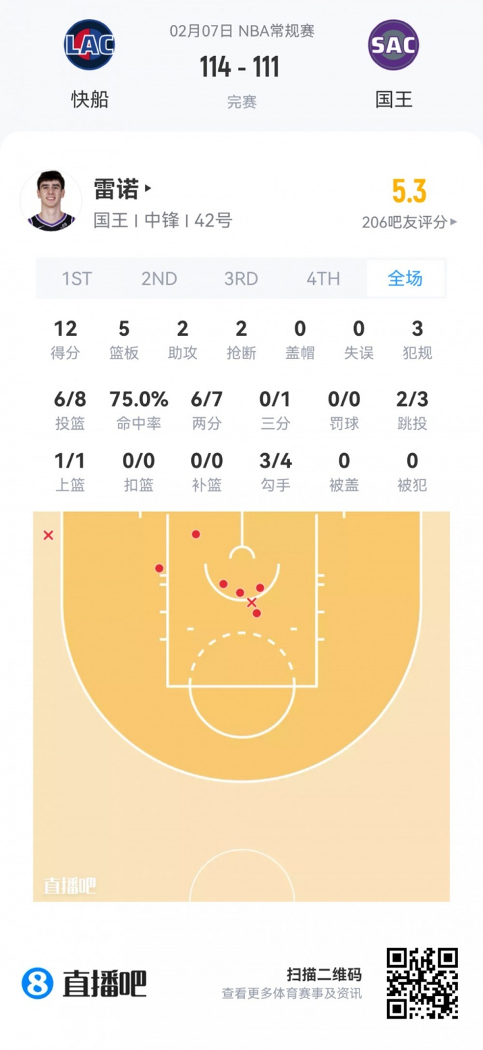 国王次轮42号秀雷诺 登场26分钟