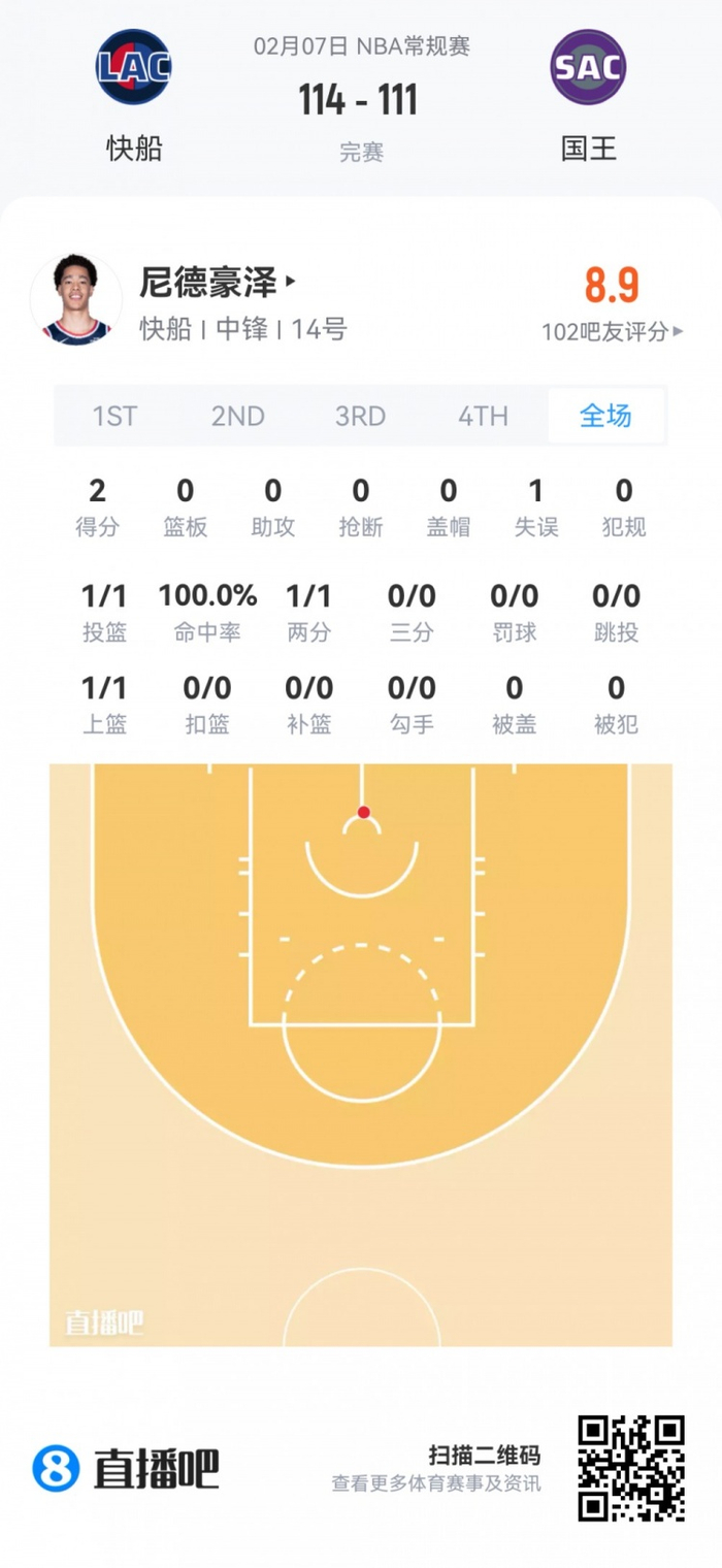 快船首轮30号秀尼德豪泽 登场4.8分钟