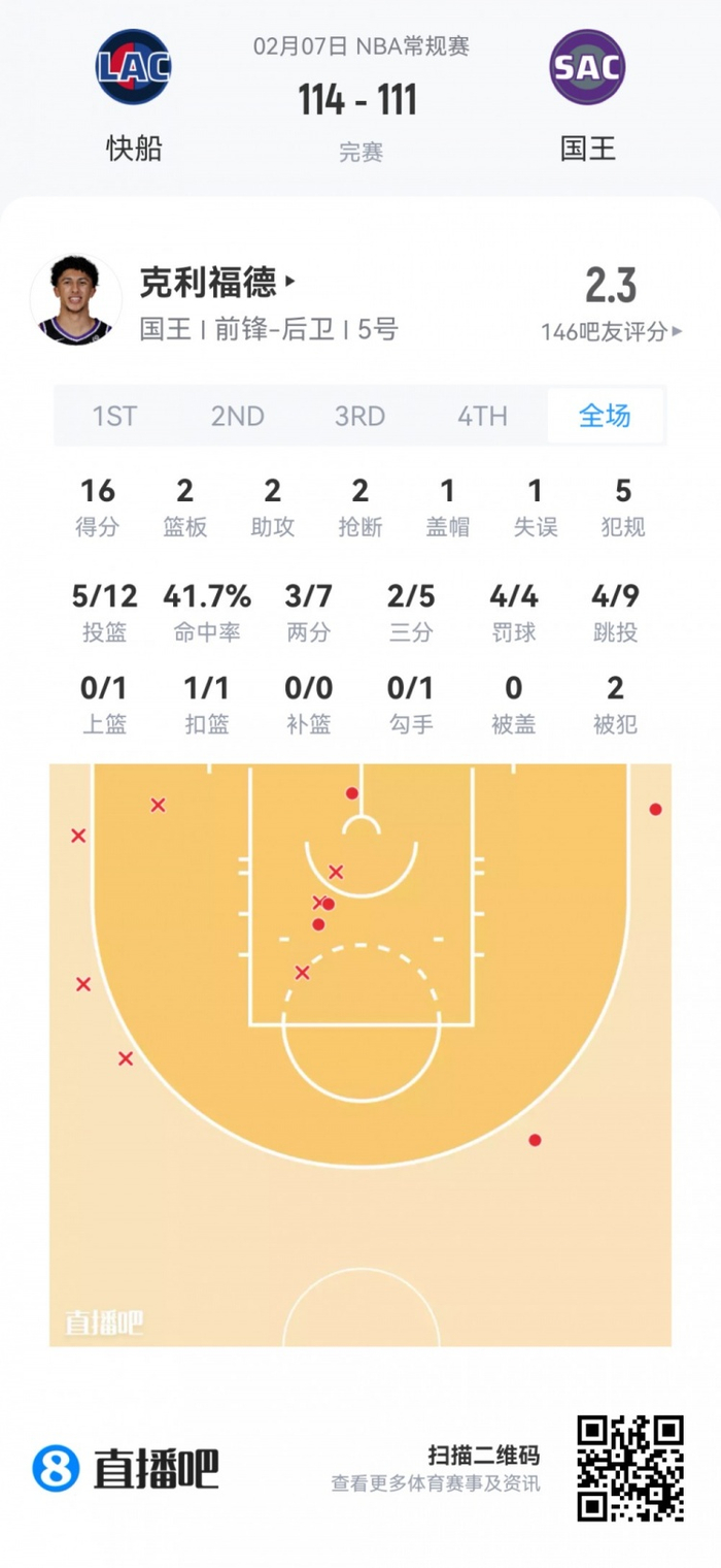国王首轮24号秀克利福德 登场33.2分钟