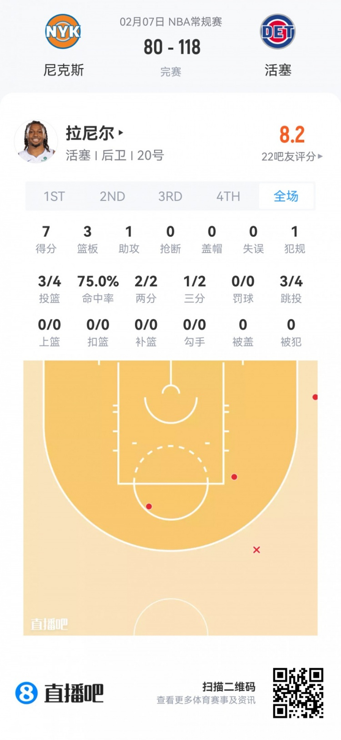 活塞次轮37号秀查兹·拉尼尔 登场5.9分钟