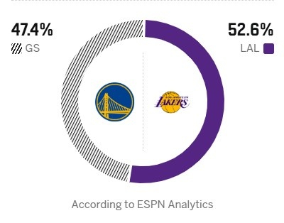 ESPN预测明日胜率:湖人52.6%、勇士47.4% 。