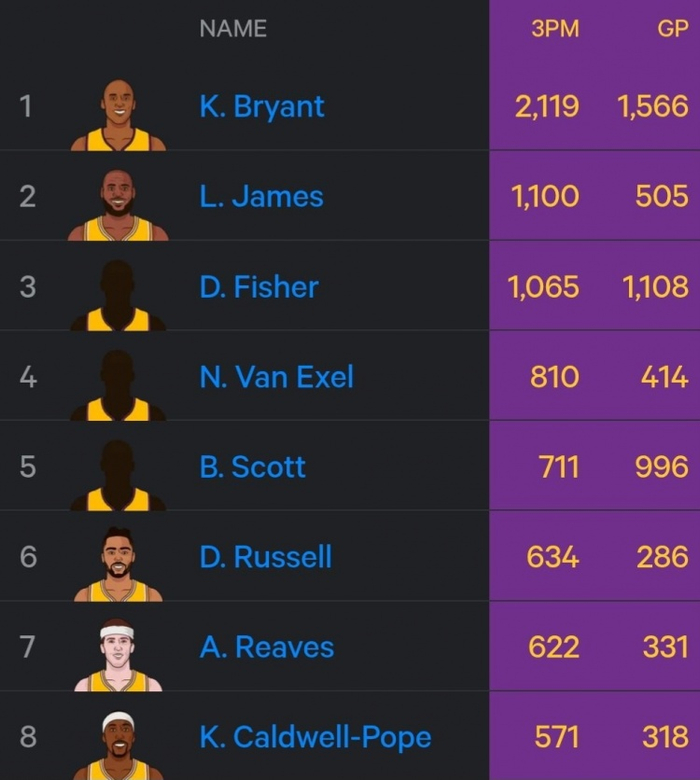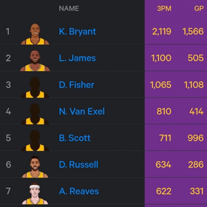 詹姆斯湖人生涯常规赛+季后赛三分数505场1100记列第二 科比领跑