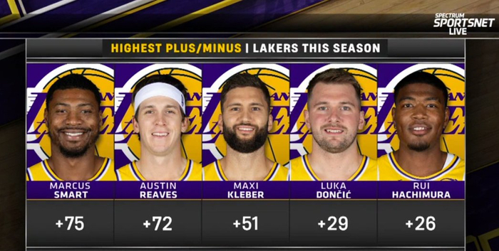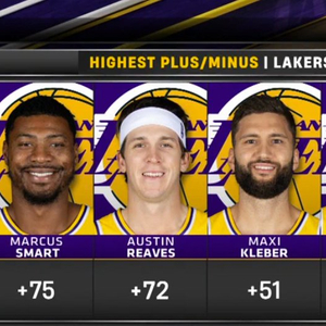 湖人本赛季总正负值排行:斯玛特+75领跑 里夫斯次之 克莱伯第三