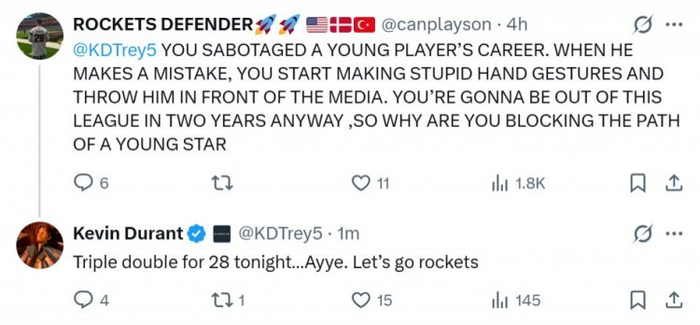 杜兰特:28号(申京)今晚得到了三双,好极了。冲啊火箭。