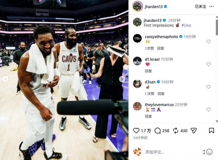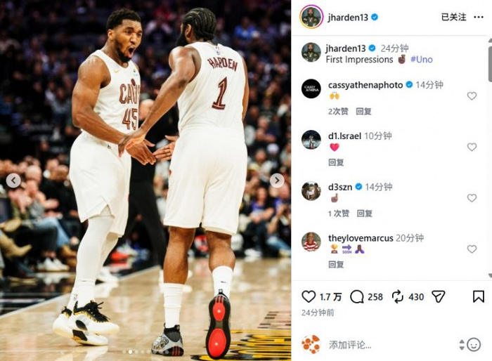 赛后,他更新社媒,晒出了多张本场比赛的照片,其中包括与好友Travis Scott的庆祝、与米切尔庆祝、骑士更衣室等多个瞬间,哈登写道:“第一印象。”