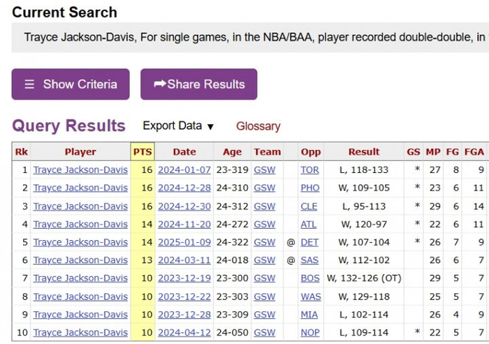 TJD猛龙首秀即拿下两双数据,而TJD在勇士的两年半时间一共才拿到过10次两双。
