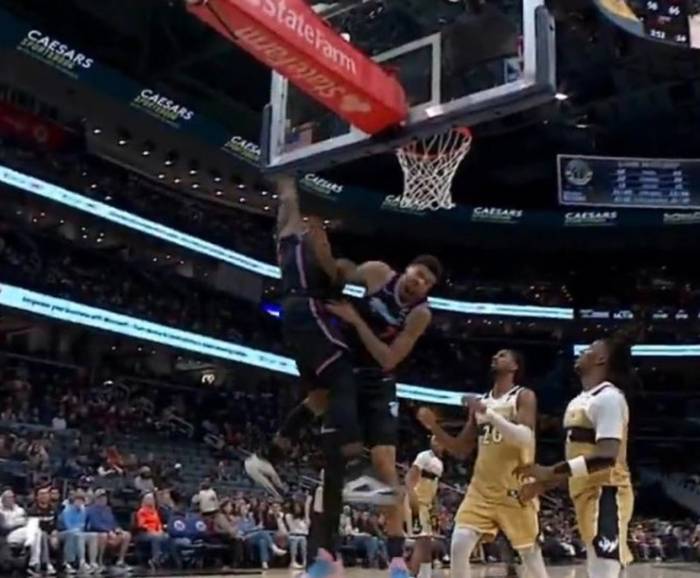 在本场比赛中,阿德巴约在一次进攻中直接隔着队友韦尔完成了一次石破天惊的补扣。