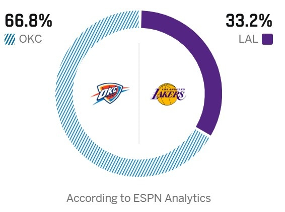 今天,ESPN预测本场比赛胜率,湖人33.2%,雷霆66.8%。