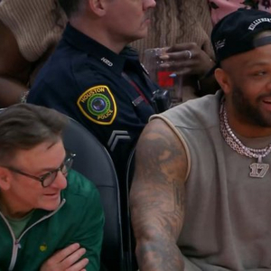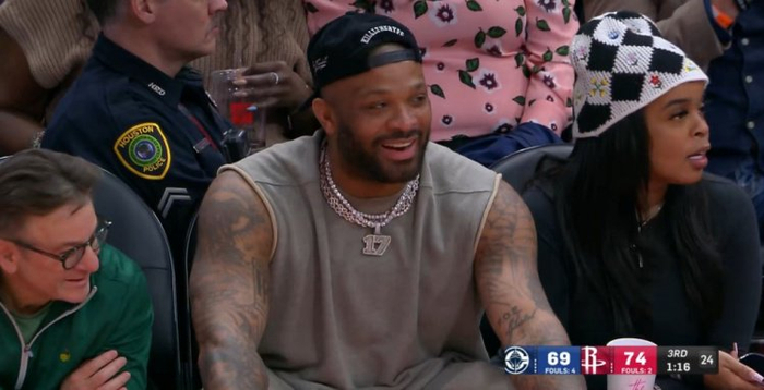两队老熟人!塔克一身休闲打扮观战火箭快船 身处火箭一侧