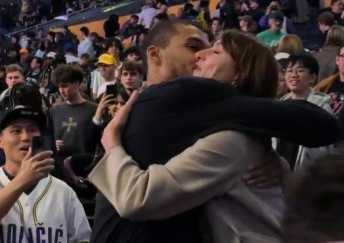 赛后,文班亚马和场边观战的母亲拥抱。