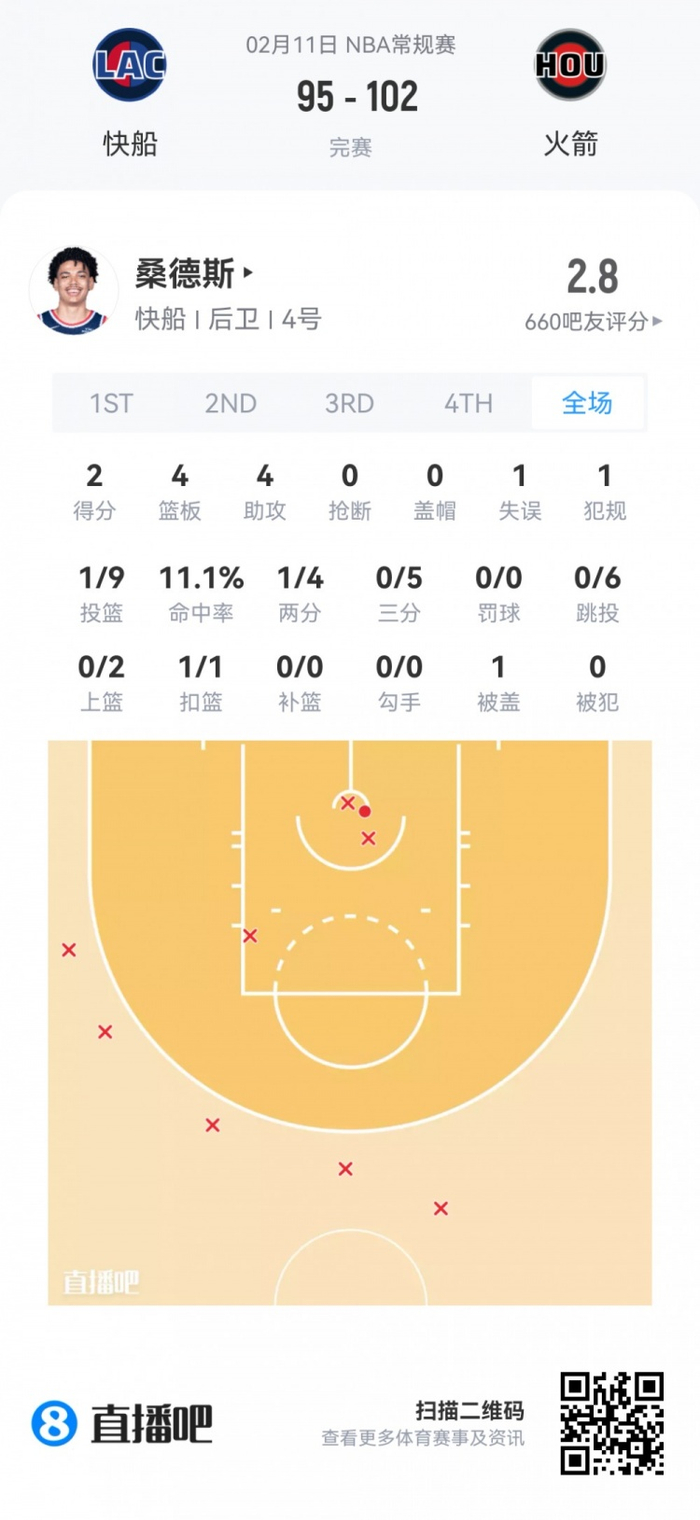 快船次轮50号秀科比·桑德斯 登场15.8分钟