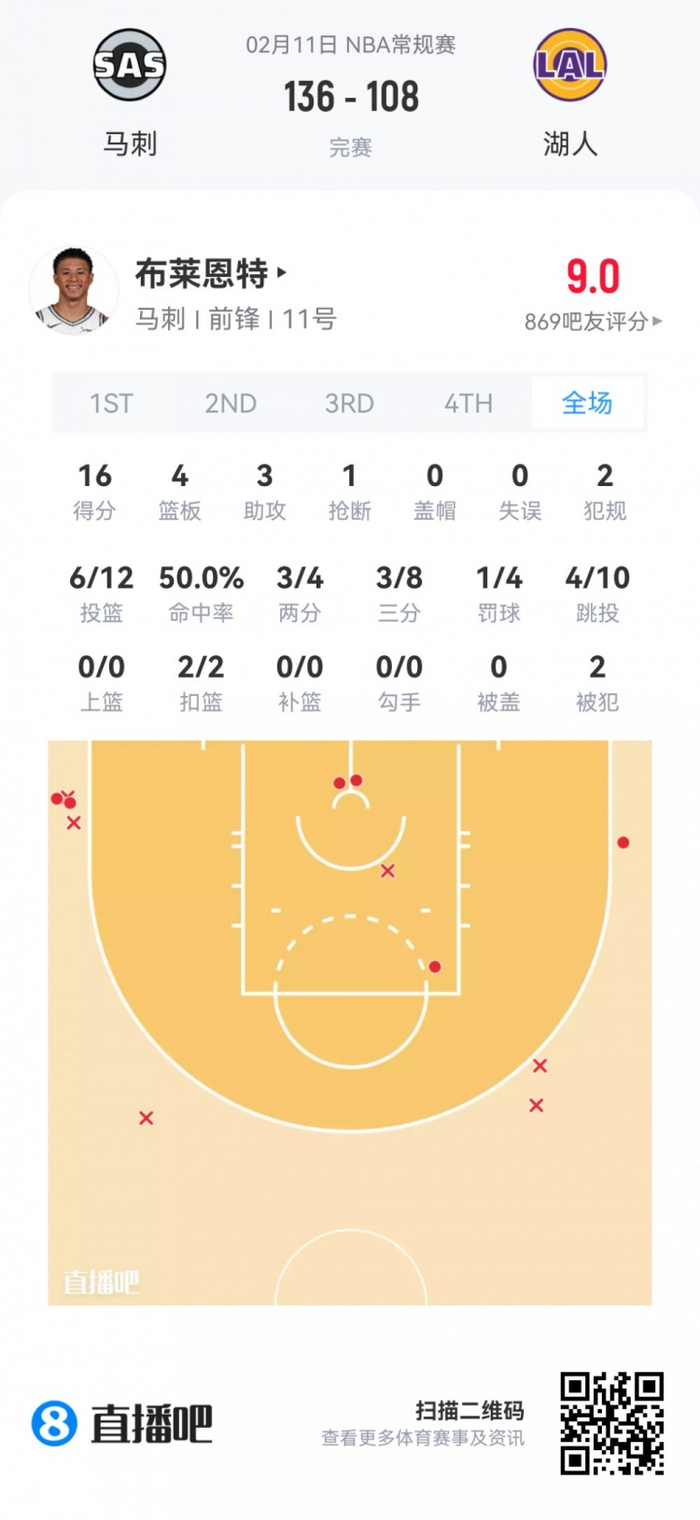 马刺首轮14号秀卡特·布莱恩特 登场26.9分钟