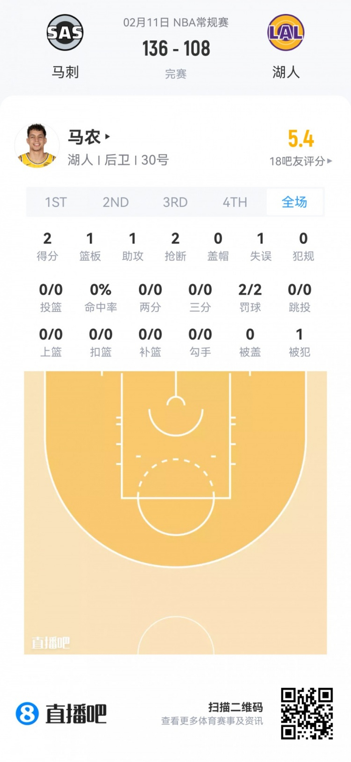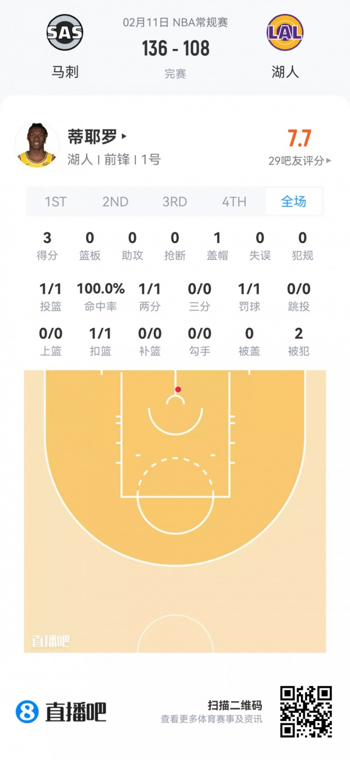 湖人次轮36号秀蒂耶罗 登场9.8分钟