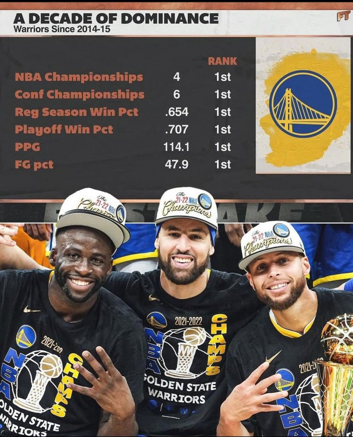 勇媒晒勇士王朝10年荣誉簿:4冠 6次西决 常规赛季后赛胜率双第1