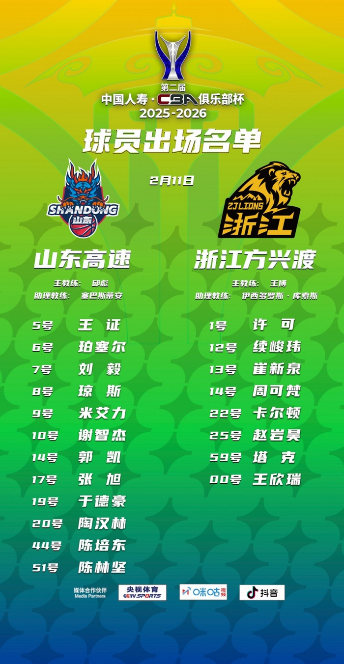直播吧2月11日讯 今晚19:30,CBA俱乐部杯季军赛,山东对阵广厦,赛前大名单公布。