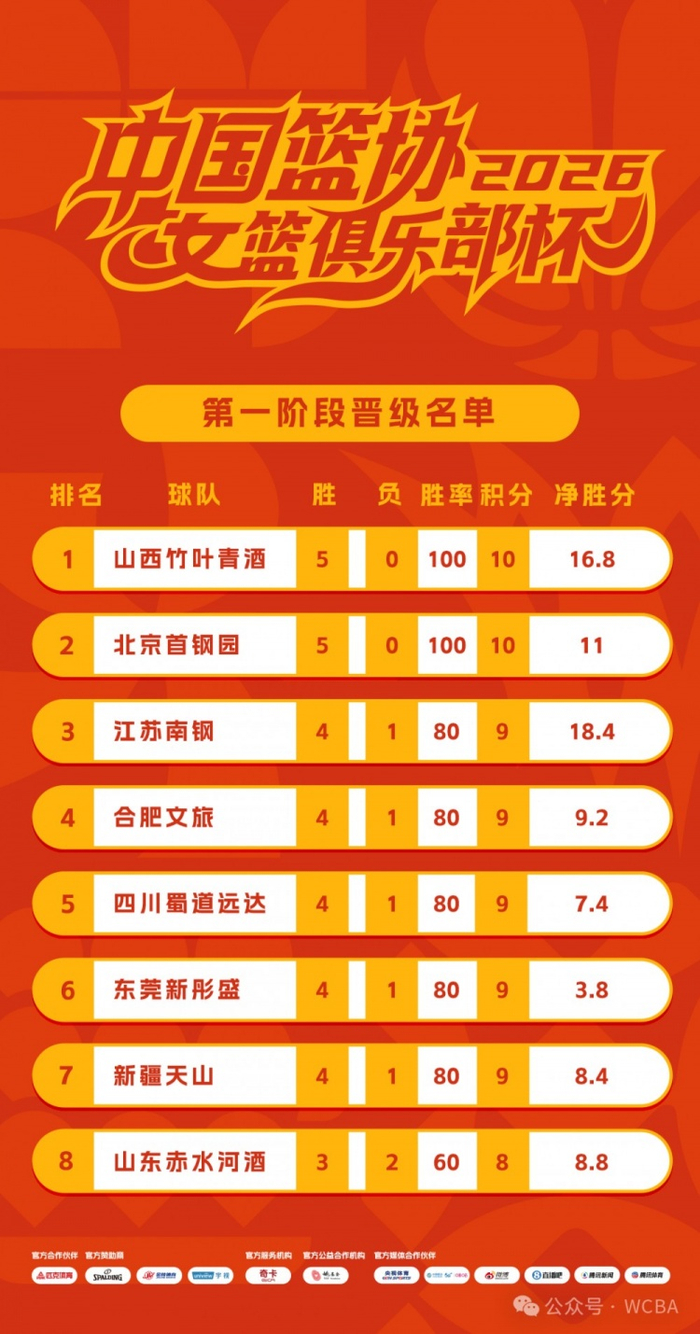 2月10日,2026年中国篮协女篮俱乐部杯预赛阶段圆满落幕。经过5个比赛日的激烈角逐,山西竹叶青酒、北京首钢园、江苏南钢、合肥文旅、四川蜀道远达、东莞新彤盛、新疆天山、山东赤水河酒八支球队成功突围,晋级决赛阶段。