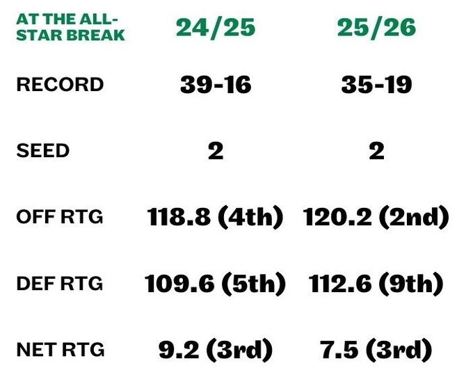 Taylor Snow晒出绿军本赛季和上赛季全明星前的战绩和攻防效率对比,并写道:“这支凯尔特人队在赛季中期只比上赛季少输了3场,这简直不可思议。