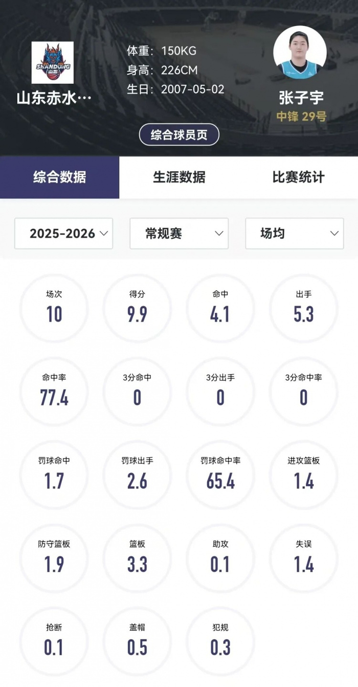 张子宇WCBA职业生涯第一个赛季的数据最后定格在了十场比赛,场均8.5分钟,得9.9分3.3篮板0.1助攻0.5盖帽1.4失误。