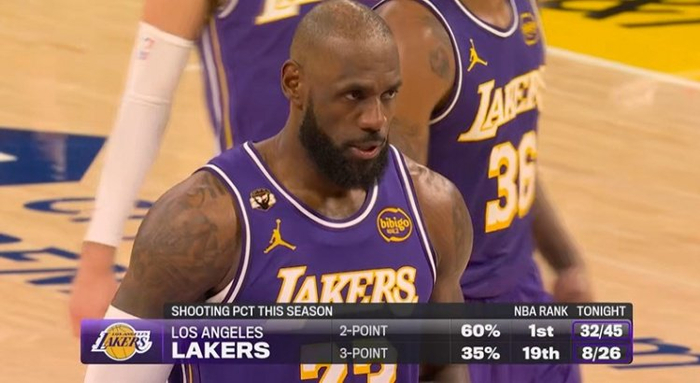 线内线外两重天!湖人赛季两分球命中率联盟第1 三分球命中率第19