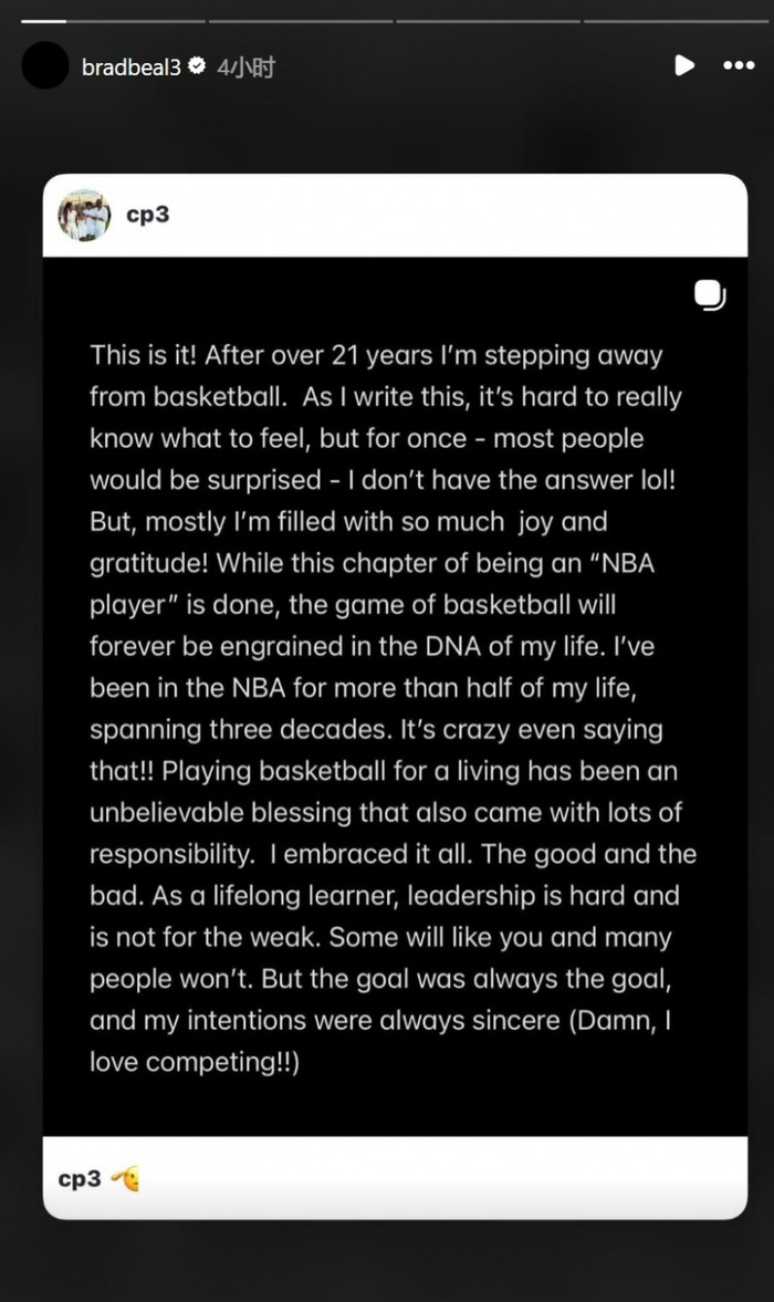 都别忘了我呀!比尔转发保罗退役长文 送上无声祝贺