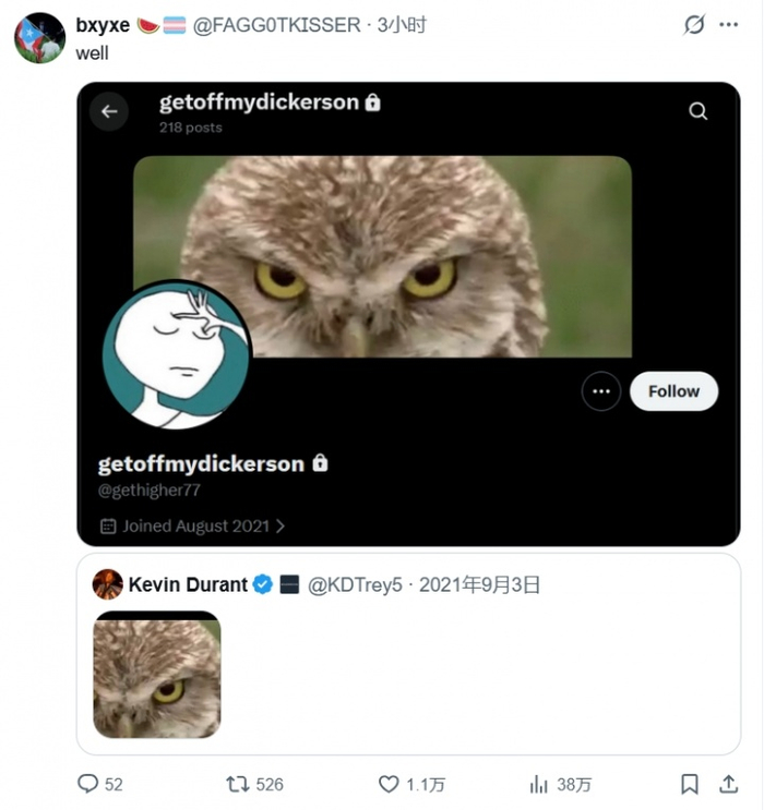 并且,该账号的资料背景图片,也曾在杜兰特的大号里出现过(下图的猫头鹰):