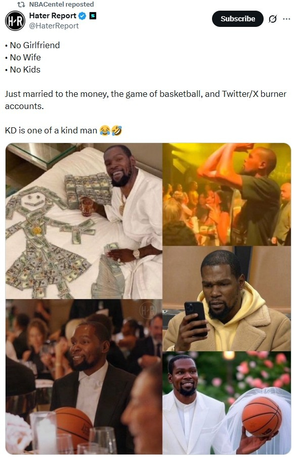 美媒评价杜兰特:没女朋友&妻儿 与篮球&推特&钱结婚 KD独一无二 NBA综合 02.1611:52 关注 • 没有女朋友• 没有妻子• 没有孩子他和金钱、篮球和推特/小号结婚。KD真是个独一无二的人😂🤣【来源:直播吧】