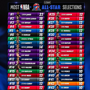 历史上48位至少10次入选全明星的球星!老詹22次第1 科比18次第3