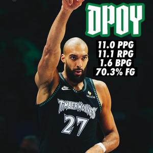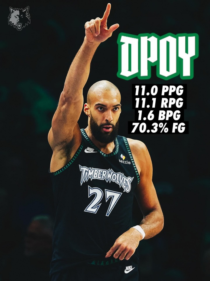 戈贝尔场均11分11.1板1.6帽&命中率70.3%!森林狼官方:DPOY