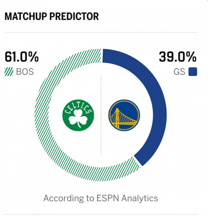 ESPN对本场胜率进行了预测,勇士胜率39%,凯尔特人则是61%。