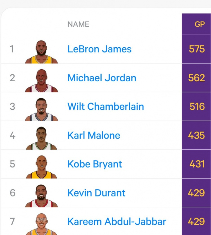 据统计,这是杜兰特生涯第429次砍下30+,追平贾巴尔并列历史第六,距离第五的科比两场。具体如下: