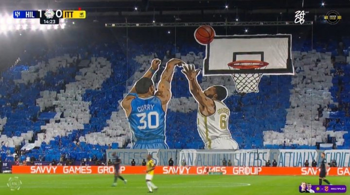 今日利雅得新月1-1战平吉达联合的沙特国家德比赛中,利雅得新月主队拉巨型TIFO致敬库里,象征着在对手球队头上轻松拿到3分,现场解说也对这个巨型TIFO的创意颇为赞赏。