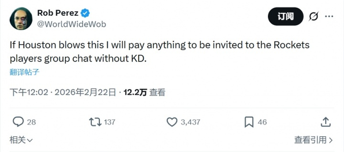 尼克斯著名媒体人Rob Perez写道:“若火箭这场球都输了,只要能够被拉到火箭队没有杜兰特的球员群聊,我愿意为此付出任何代价。”