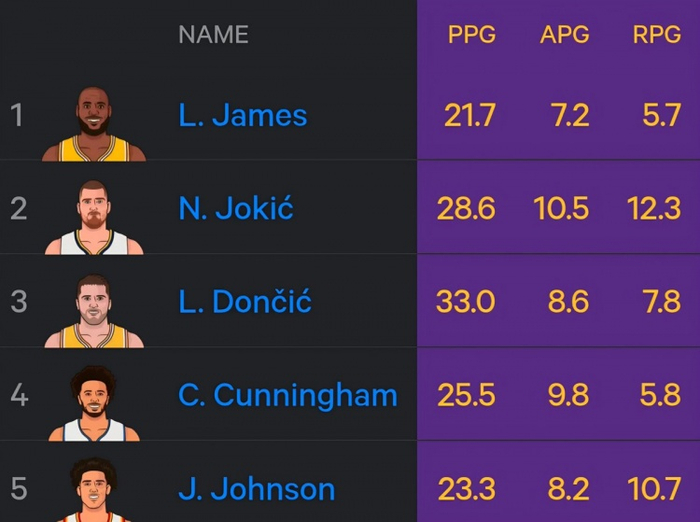 该媒体还晒出了联盟其他四位能做到场均至少21分5篮板7助攻的球员(具体如下),写道:“詹姆斯仍然比联盟95%的球员出色。”