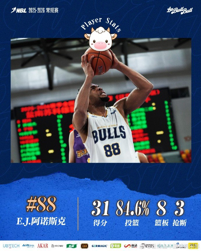 香港金牛队在客场逆转战胜盐南苏科雄狮,成功完成复仇,并取得新年开门红。本场比赛,两位外援发挥出色,阿诺斯克手感火热,以84.6%的投篮命中率砍下31分,并上演四次精彩暴扣。琼斯则在球队追分和稳住局势的关键时刻连续为球队续上火力,全场贡献26分6篮板10助攻2抢断。