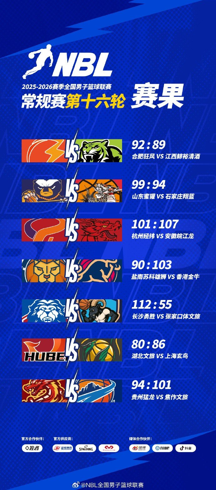 【战报】NBL常规赛第十六轮今日战罢,盐南苏科雄狮90-103不敌中国香港金牛,长沙勇胜112-55战胜张家口体文旅,湖北文旅80-86不敌上海玄鸟,贵州猛龙94-101不敌焦作文旅。