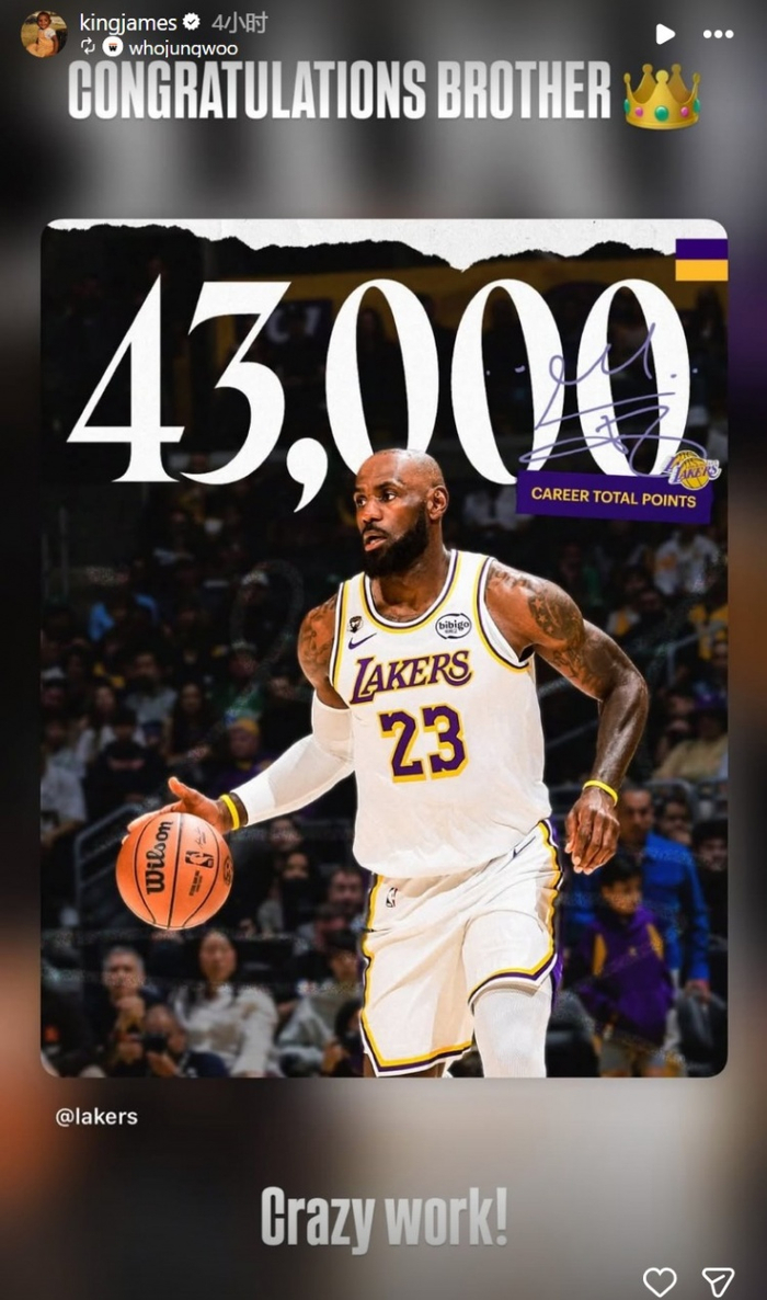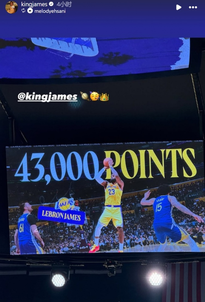 纪录不停歇!詹姆斯转发个人43000分里程碑海报:继续前进👑