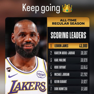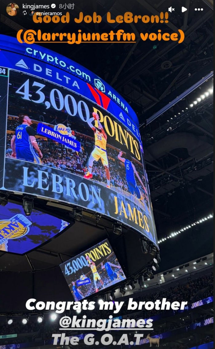 在本场比赛中,詹姆斯常规赛生涯总得分突破43000里程碑,赛后他转发了个人海报,并写道:“继续前进👑。”